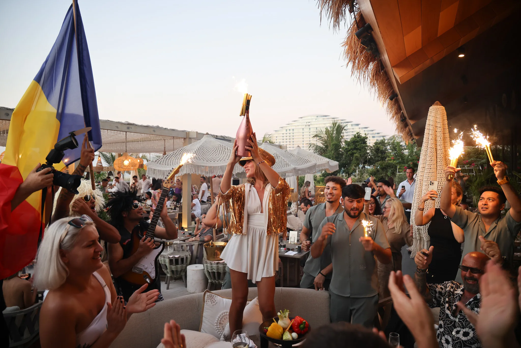 The ambiance combines Riviera-style Mediterranean luxury with Dubai glamour: beach vibes, sea views, and a skyline backdrop.